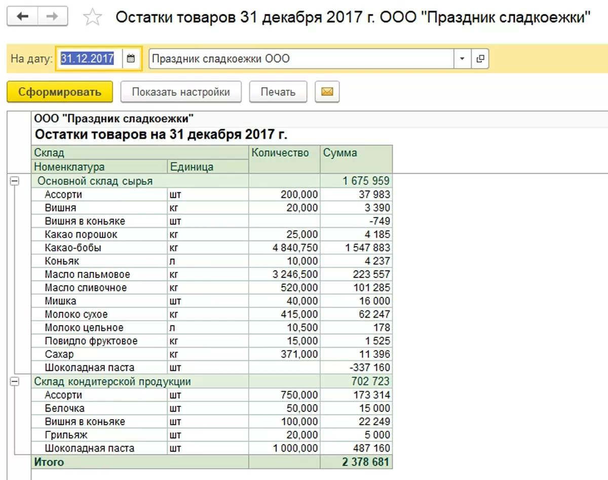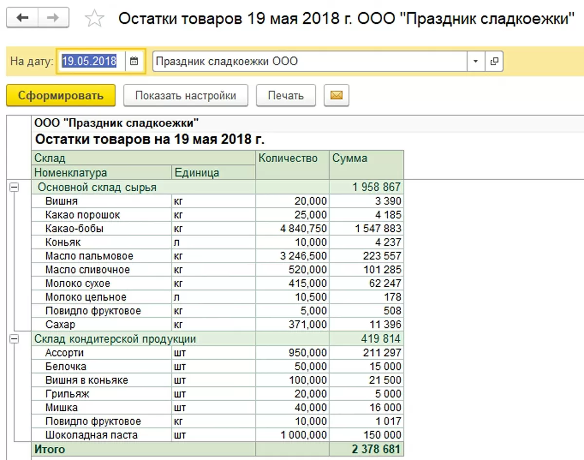 В предложенном отчете имеется два склада – сырья и кондитерской продукции. При этом склад сырья – оптовый, а склад кондитерской продукции – розничный. По общему правилу в конфигурациях 1С с розничных складов можно производить как оптовую, так и розничную продажу; в то время как с оптовых складов можно производить только оптовую продажу. Если товар поступил и находится на оптовом складе, а его нужно реализовать в розницу, то потребуется перемещение товаров между складами.