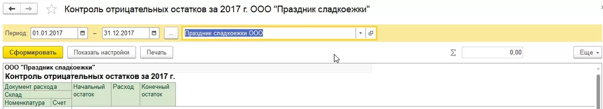 Если отрицательные остатки в Системе имеют место, то отчет будет заполнен. Если отрицательных остатков в Системе нет, то результат заполнения – пустой отчет.