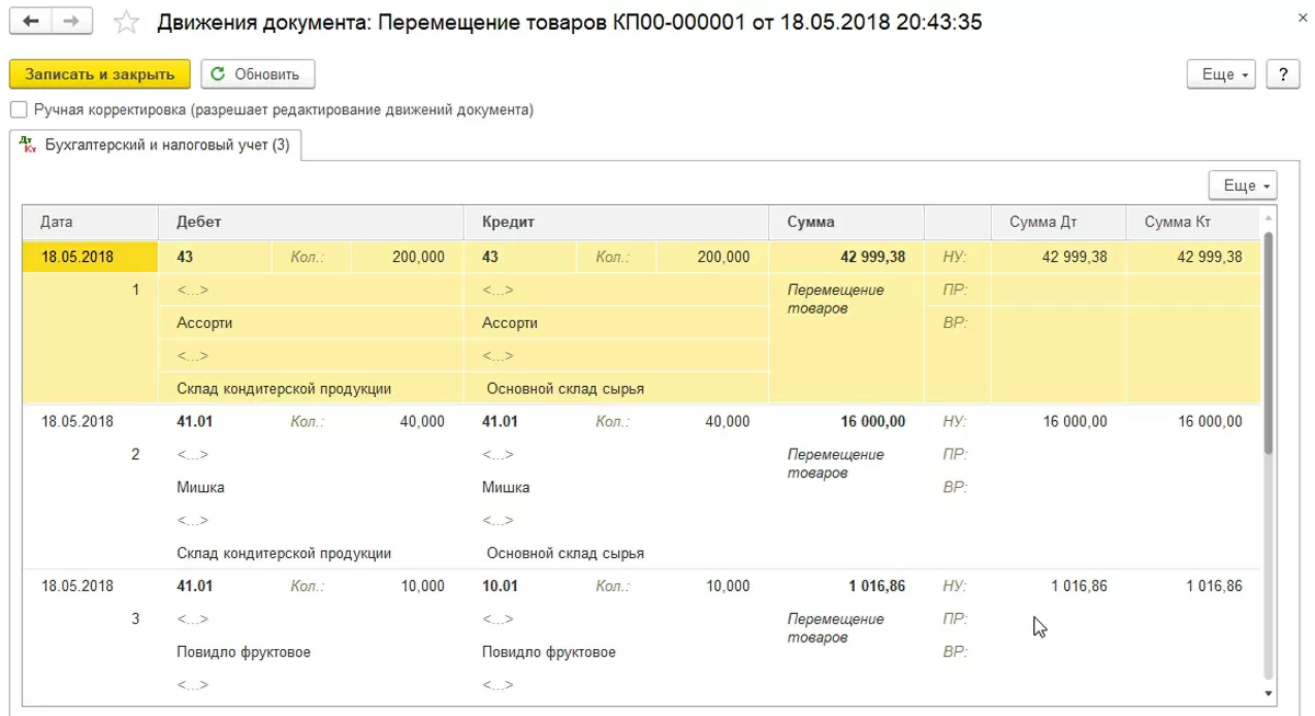 Анализируя проводки, убеждаемся, что товары, продукция и материалы были перемещены с основного склада материалов на склад кондитерских изделий.