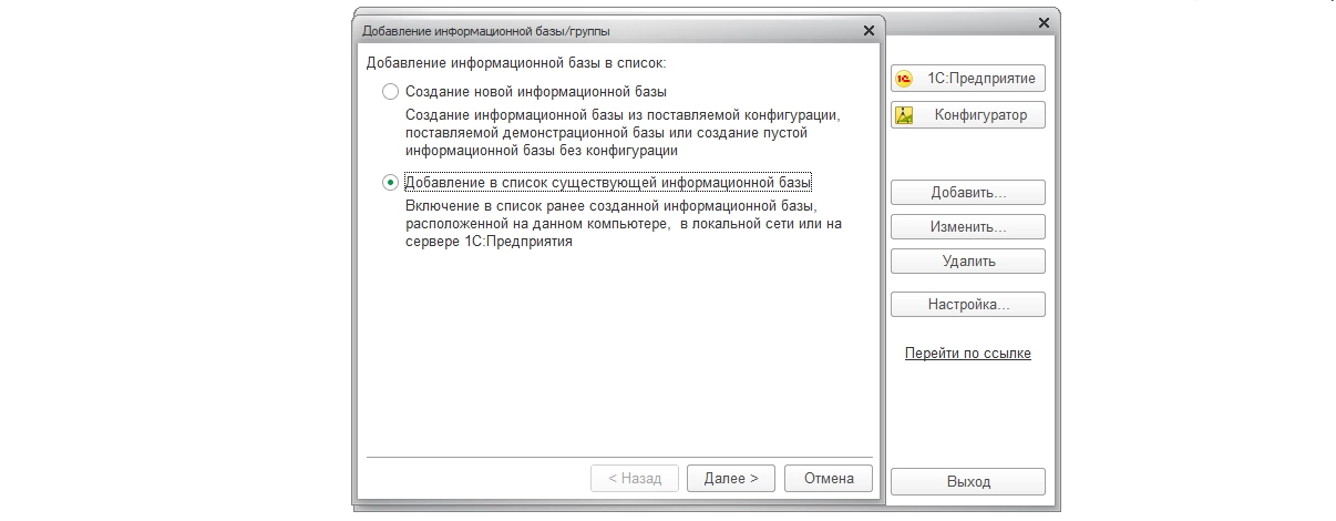 Поскольку речь идет о базе, которая уже существует, в окне выбора режима щелкаем по «Добавлению в список существующей ИБ».