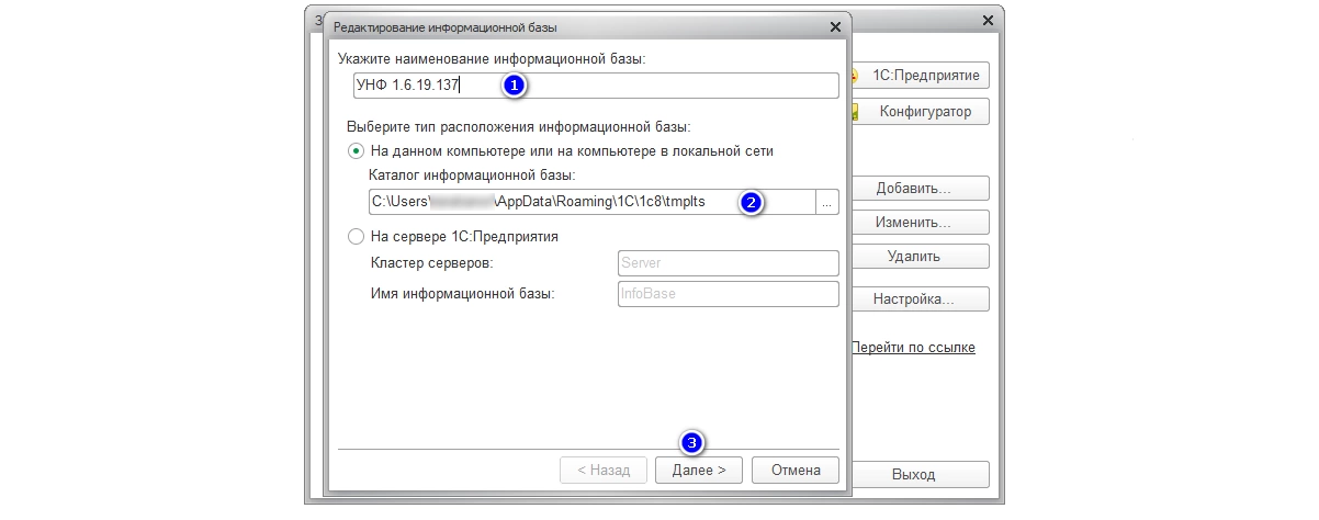В появившейся форме указываем наименование (1) и тип расположения базы (сохраненный ранее адрес (2)). Тип расположения «На данном компьютере или на ПК локальной сети» (файловая база) требует выбора каталога, куда будет установлена информационная база.