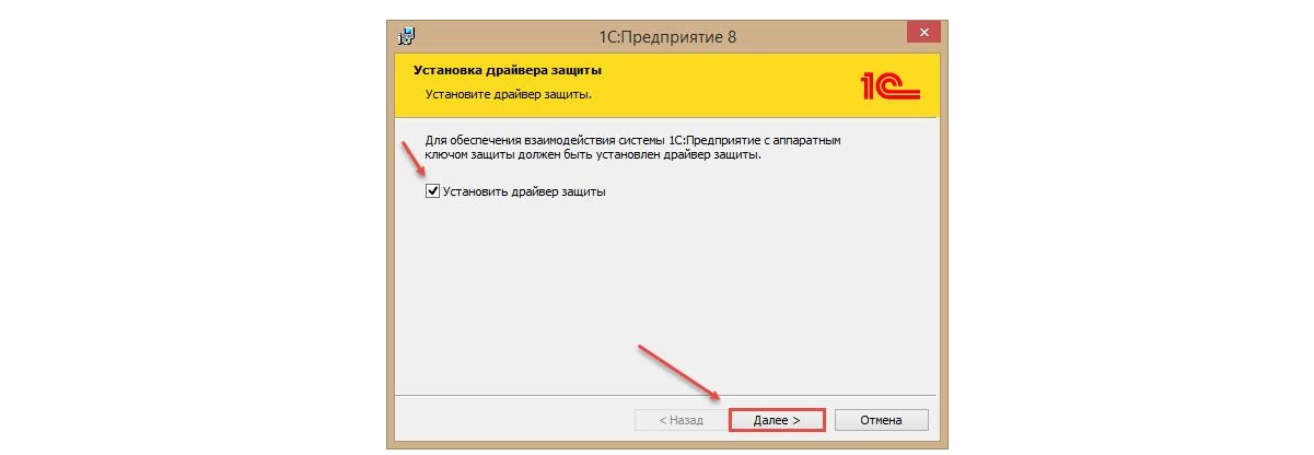 При использовании программной лицензии галочку можно снять. Так как в данном случае платформа устанавливается на новое устройство, то есть впервые, оставляем флажок «Установить драйвер защиты» и нажимаем «Далее».
