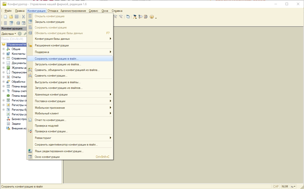 Чтобы сделать копию базы целиком, с рабочими настройками шрифтов, отчетов и т.д., нужно выбрать пункт меню «Конфигурация» и далее «Сохранить конфигурацию в файл».