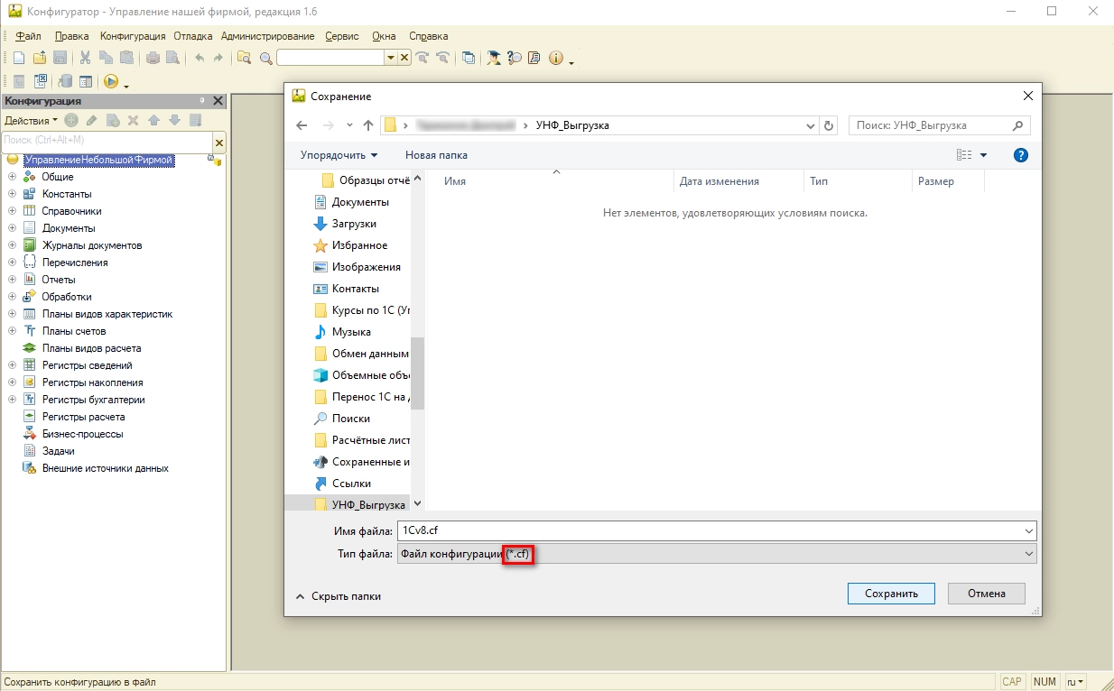 Система предложит сохранить файл с расширением .cf (это и есть конфигурация).
