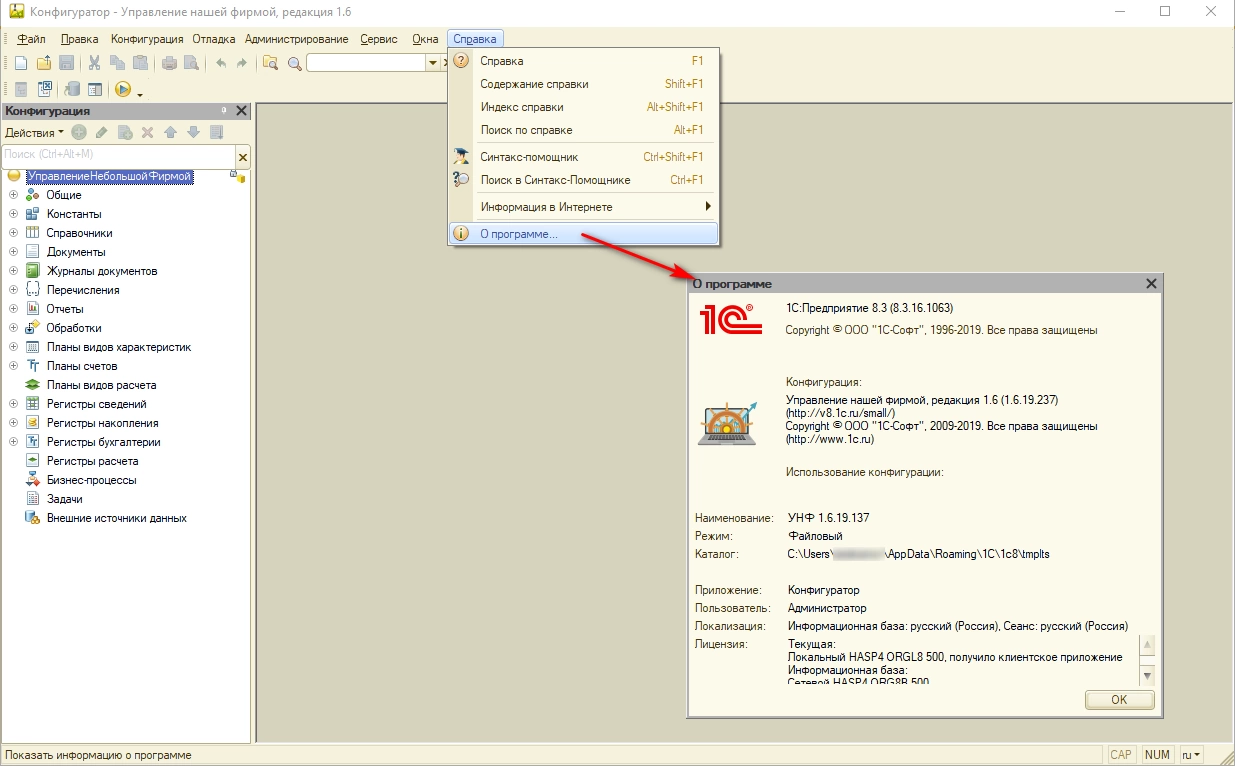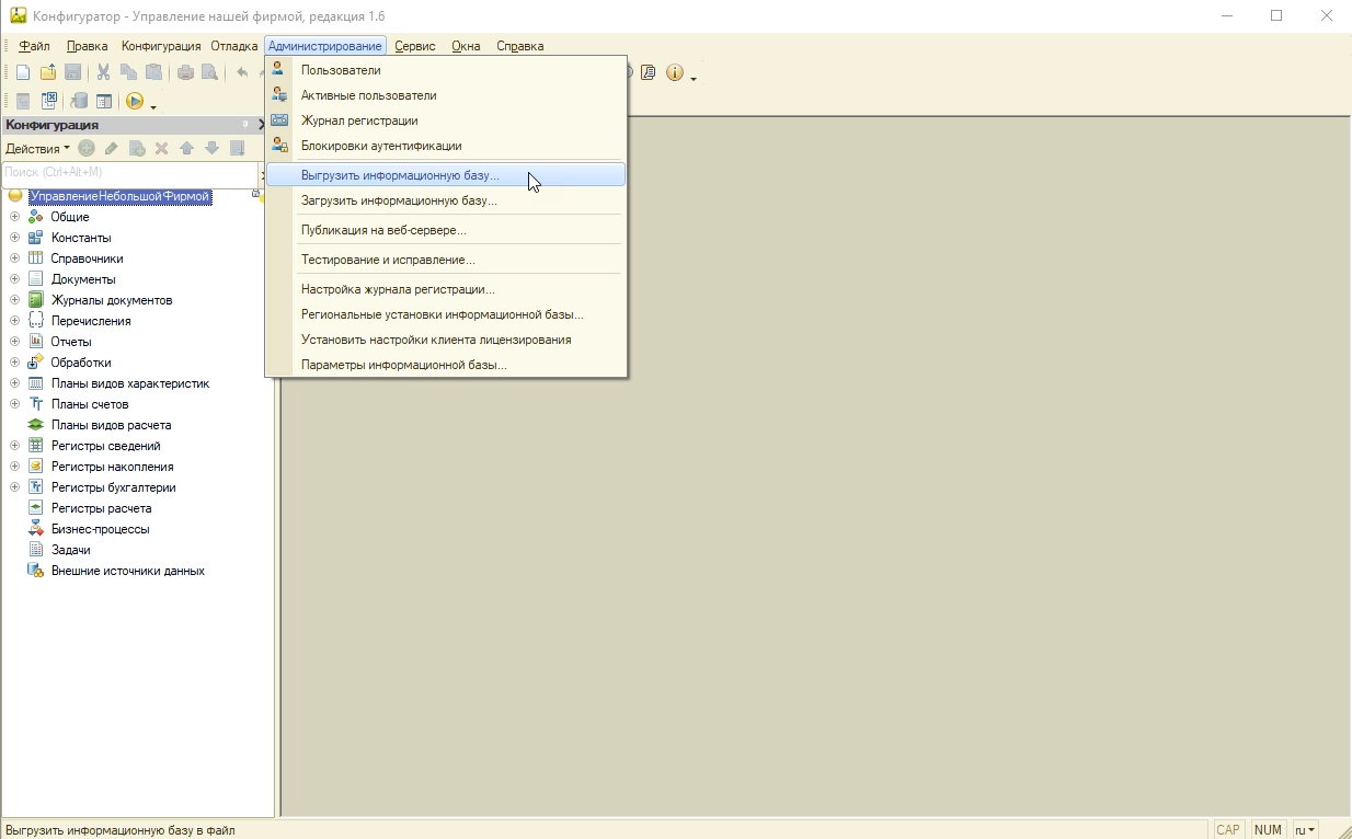 Для этого требуется привлечение ИТ-специалиста и 1С консультация. Самостоятельно пользователь продуктов на платформе «1С:Предприятие» сможет перенести только файловую версию базы данных при наличии прав Администратора, позволяющих работать в конфигураторе. Рассмотрим процесс переноса базы на примере конфигурации «Управление нашей фирмой 1.6.19.237».