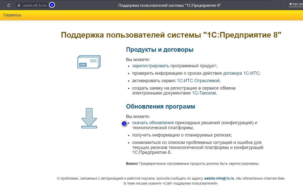 Следующий шаг – установка платформы (файла setup.exe), который можно либо взять с диска ИТС, либо скачать (2) с сайта поддержи пользователей 1С (1), используя учетную запись в ИТС.