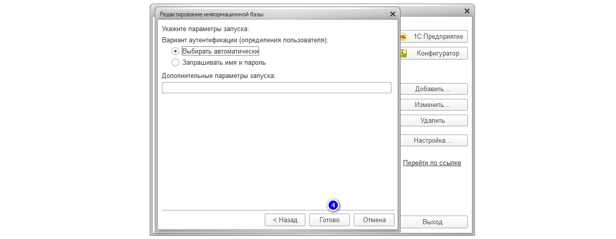 Если каталога до этого не было, система «1С:Предприятие 8» автоматически создаст его при запуске. Окно параметров запуска является заключительным. Если настройки по умолчанию удовлетворяют требования, при нажатии «Готово» база будет добавлена в список.