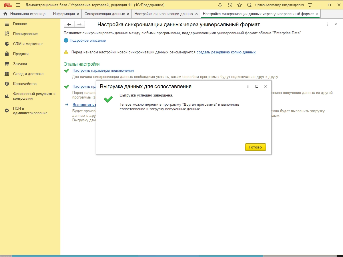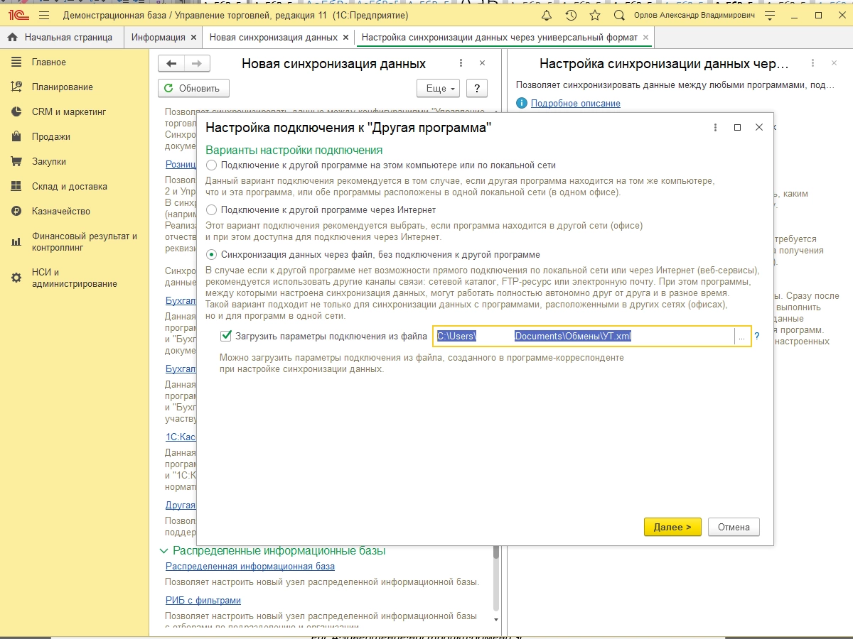 После того как сформирован универсальный файл обмена xml, используем модифицированный план обмена, который мы заранее подготовили, и настраиваем обмен между конфигурациями 1С.