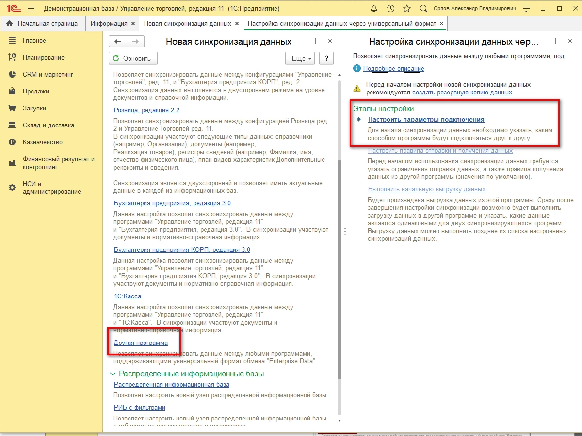 Первичная настройка данных схожа с типовой настройкой обмена.