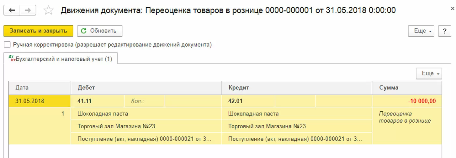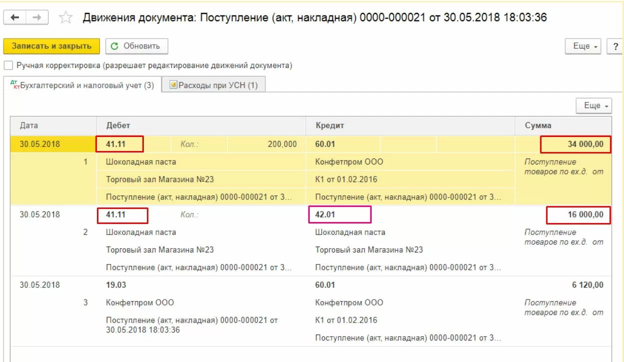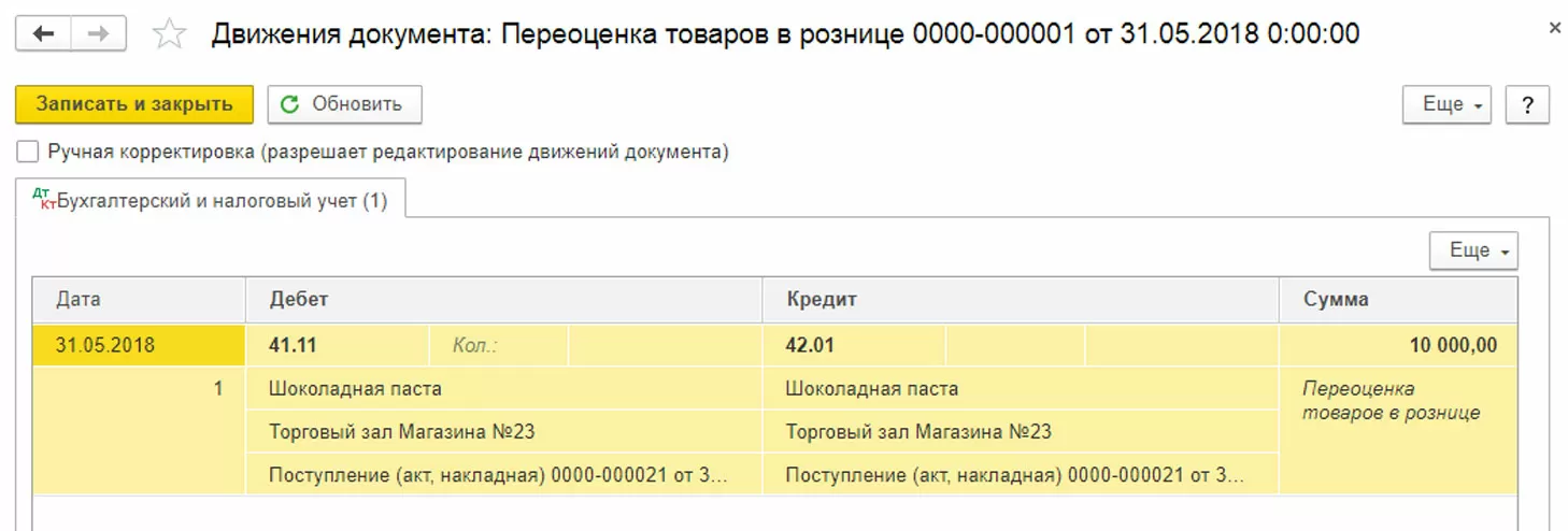 Например, на розничный склад поступил товар в количестве 200 шт. по цене поступления 170 руб. Розничную цену мы установили в размере 250 руб. При проведении поступления программа оприходует на 41.11 товар по покупной стоимости в сумме 34 000 руб., а разницу между покупной и продажной ценой в размере 16 000 руб. отразит на сч.42.01 «Торговая наценка в автоматизированных торговых точках». В итоге на сч.41.11 будет числиться товар по розничной цене, а наценка на сч.42.01.