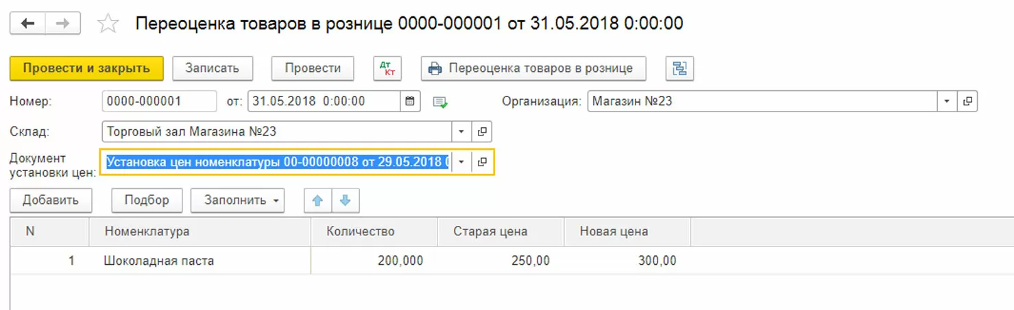 Наполнить документ переоценки списком товаров можно с помощью кнопок «Добавить», но в этом случае придется вручную заполнять все поля, а через «Заполнить» в документ попадут данные по всем остаткам на складе или только по изменившемся ценам, как это произошло выше.
