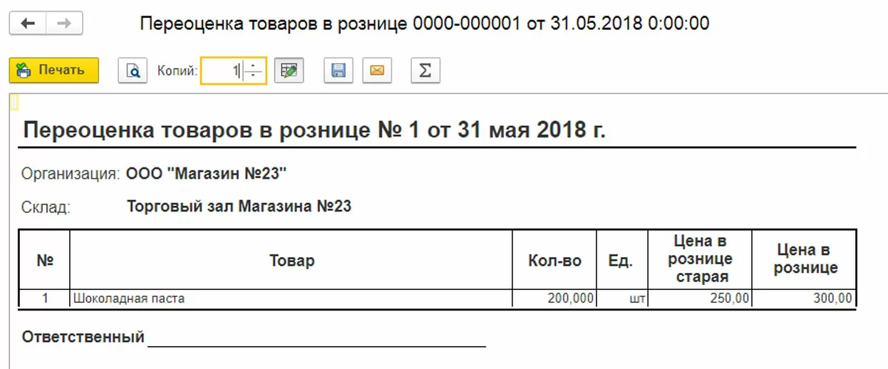 Из документа можно распечатать форму «Переоценка товаров в рознице» с отображением товара, его старой и вновь установленной цены.