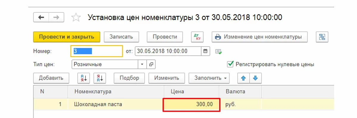Когда возникает необходимость провести переоценку товара, например, у нашего товара увеличилась розничная цена, это отражается документом «Установка цен номенклатуры».