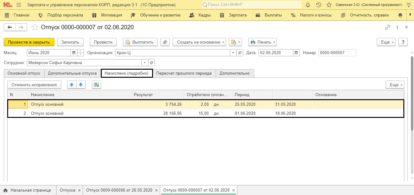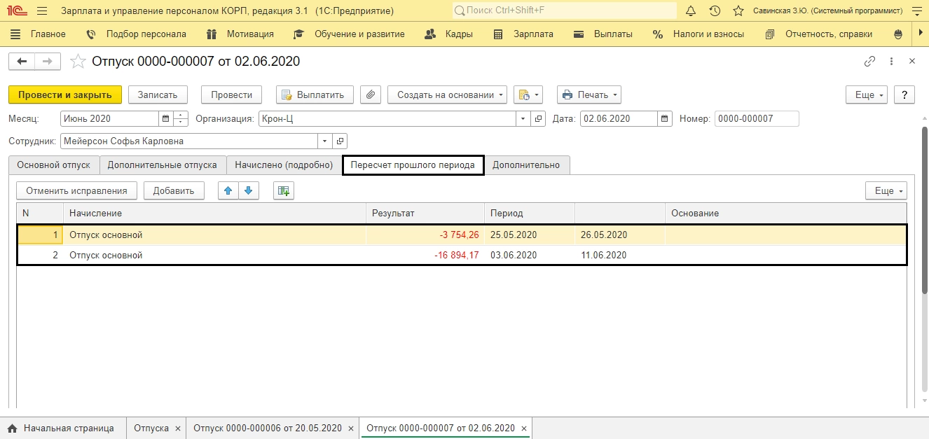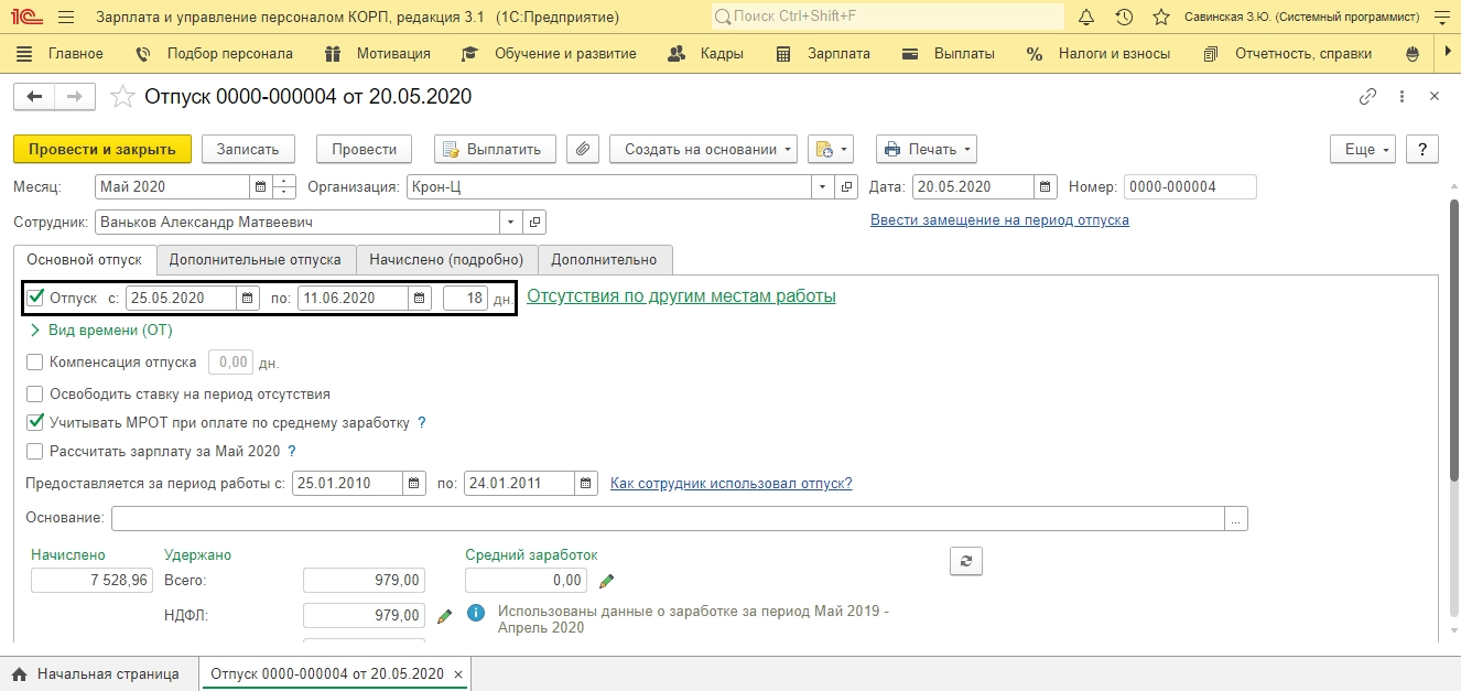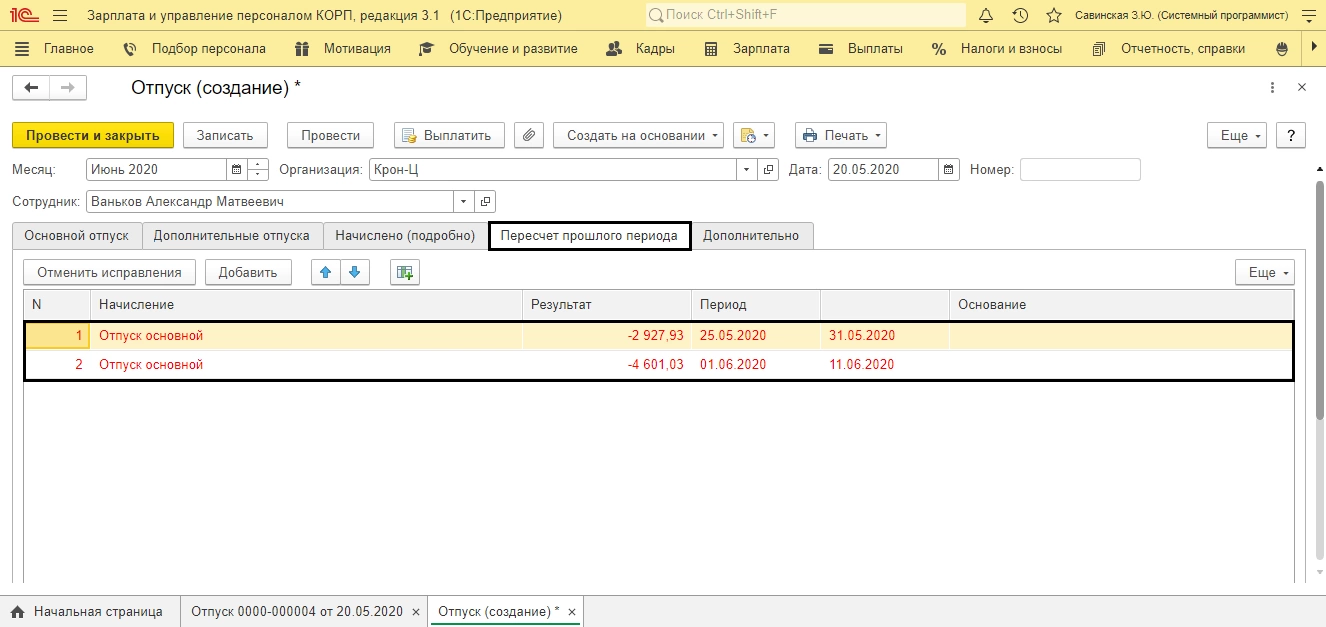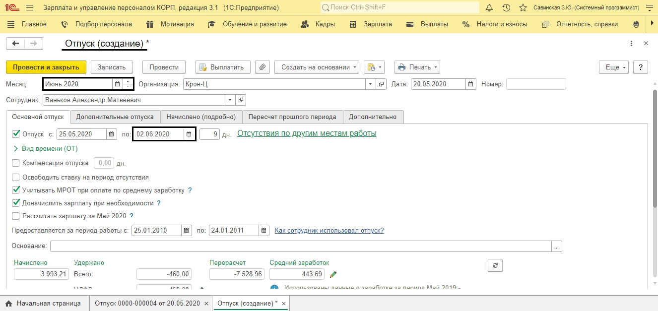 Сотрудник Ваньков Александр Матвеевич ушел в отпуск на период с 25.05.2020 по 11.06.2020 года. За этот период ему начислены отпускные, зарплата рассчитана и выплачена. В следующем месяце по приказу руководителя он был отозван из отпуска. Требуется пересчитать начисление и изменить даты отпуска.