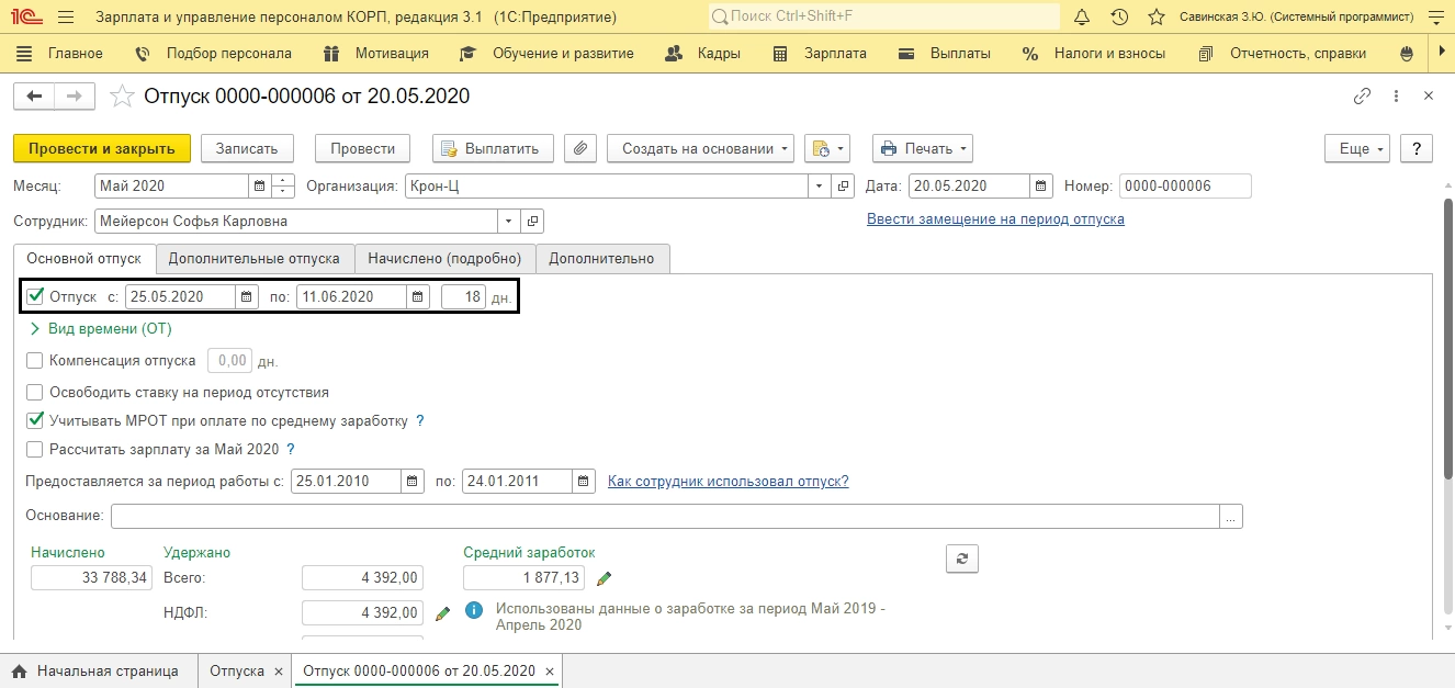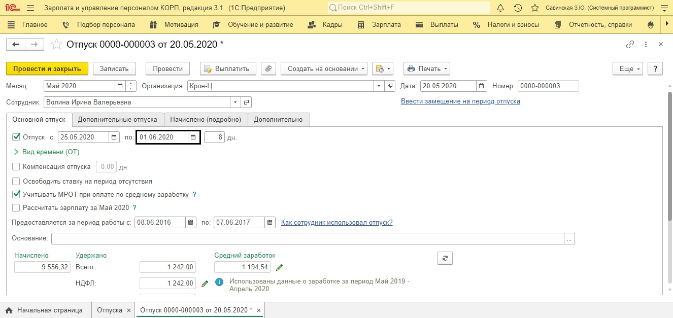 Откройте первоначальный документ начисления отпускных и исправьте дату «По». Дни отпуска и начисление пересчитаются, исходя из новых данных.