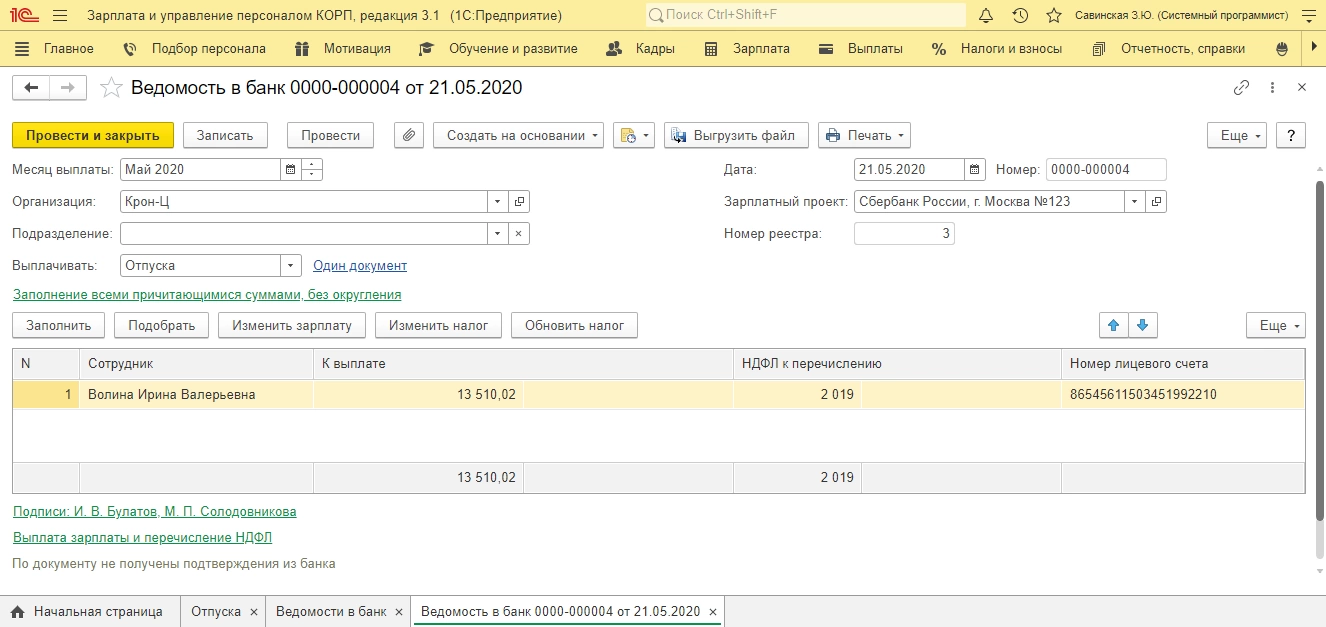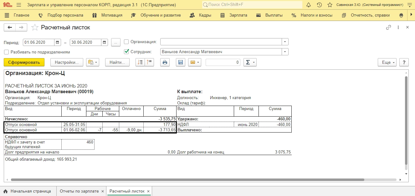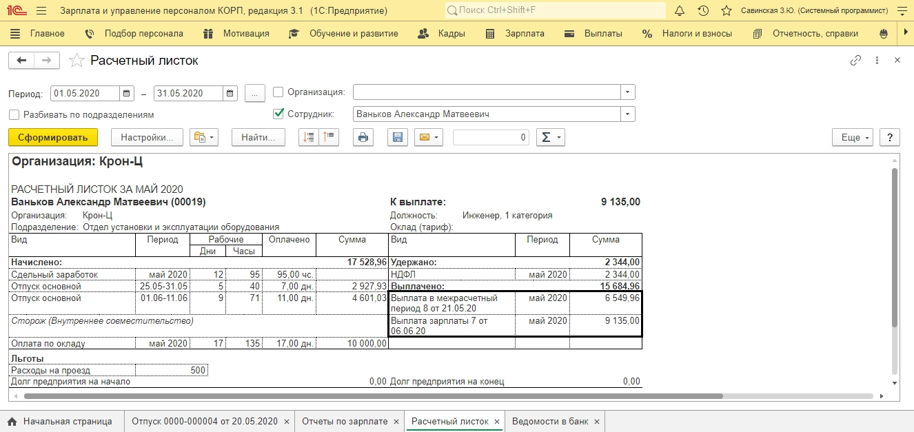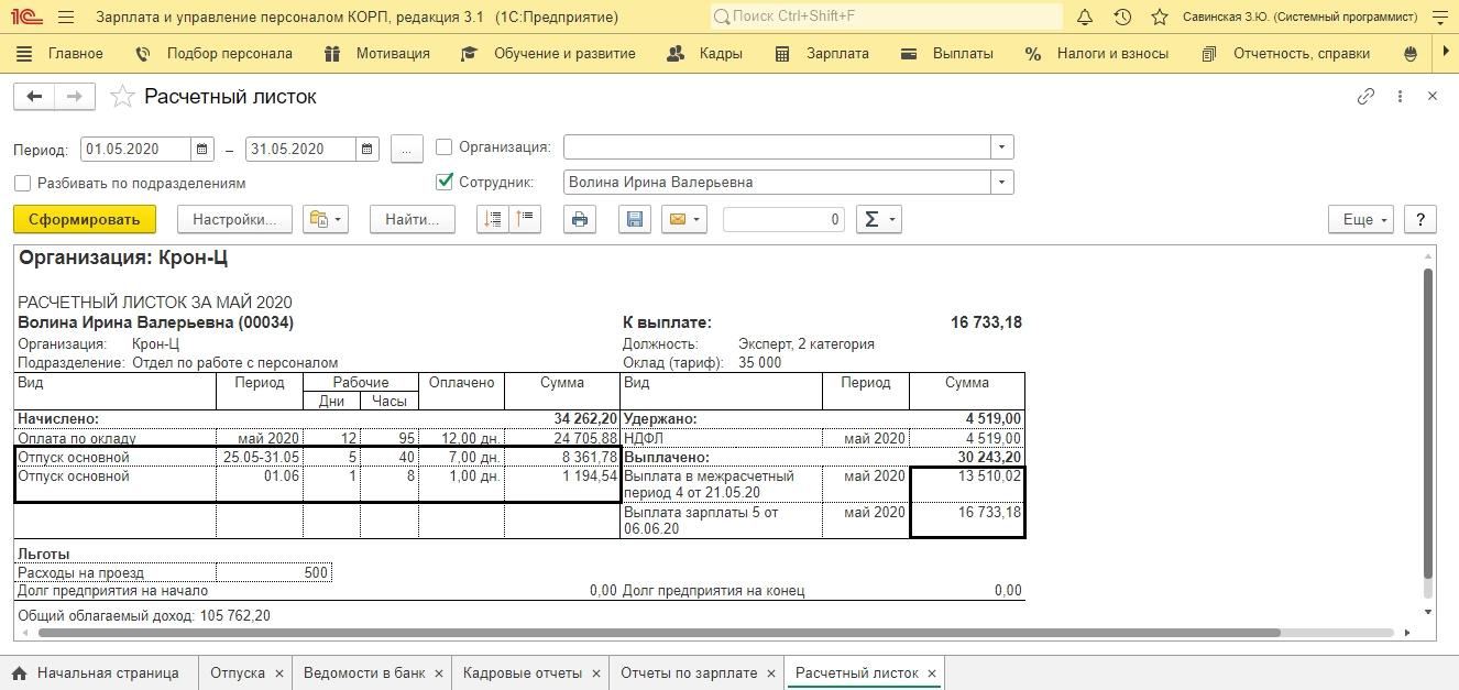 Из расчетного листка сотрудника видно, что отпускные начислены за период с 25.05.2020 по 11.06.2020 и выплаты за период закрыты.