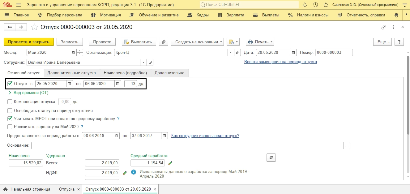 Например, сотруднице Волиной Ирине Валерьевне, предоставлен отпуск на период с 25.05.2020 по 06.06.2020 года, начислены и выплачены отпускные. По решению руководства ее отзывают из отпуска. Необходимо изменить дату окончания отпуска и выполнить перерасчет отпускных в 1С.