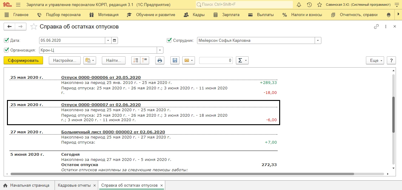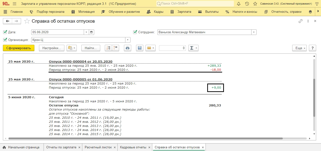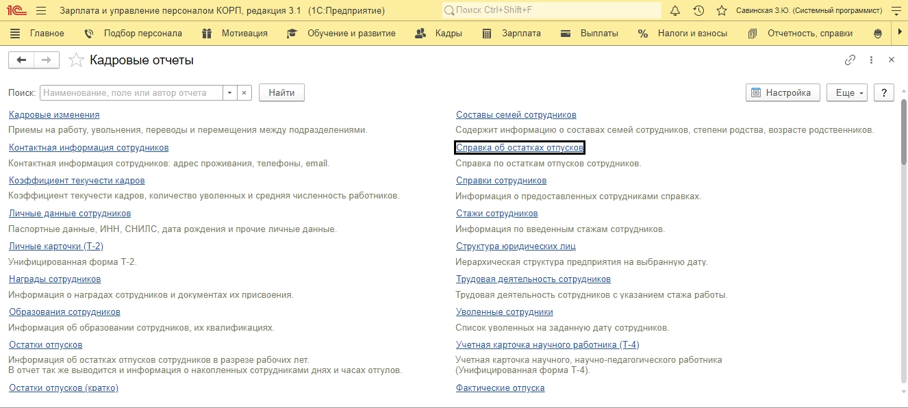 При проведении перерасчета производится возврат дней неиспользуемого отпуска сотрудника. Из расчетного листка и в самом документе перерасчета видно, что дни отмечены красным и стоят со знаком минус. Чтобы проконтролировать данные изменения, используя отчеты, откройте раздел «Зарплата-Кадровые отчеты» и найдите «Справку об остатках отпусков». С подробной статьей об остатках отпусков в 1С 8.3 ЗУП 3.1 вы также можете ознакомиться на нашем сайте.