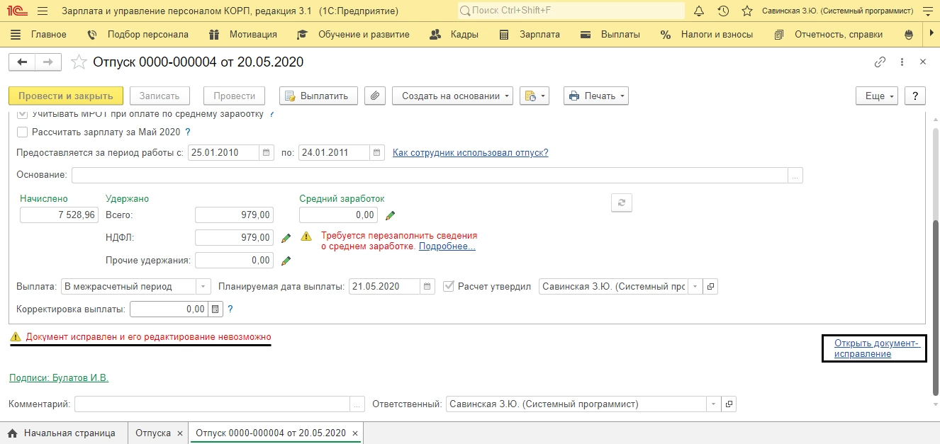 Перерасчет отпуска в 1С:ЗУП, если наступил другой период расчета зарплаты, требует введения документа-исправления.