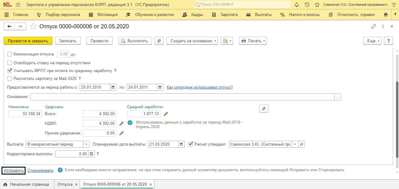 Далее откройте первоначальный документ начисления отпуска и в его нижней части нажмите «Исправить».