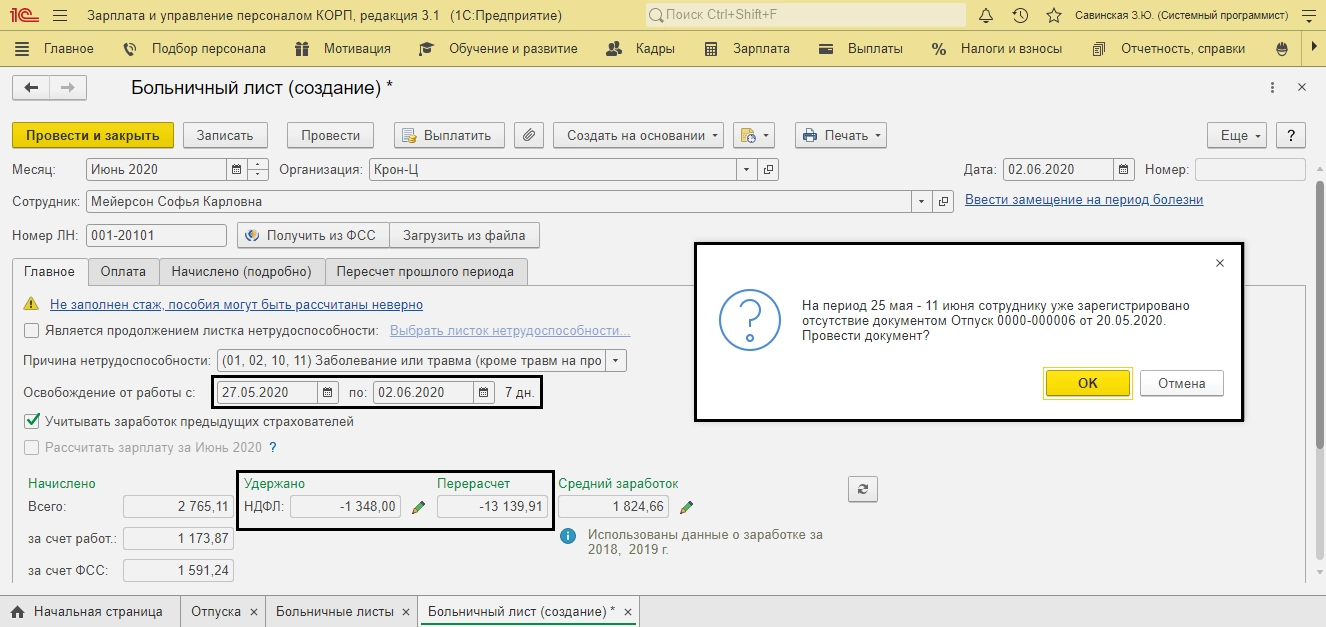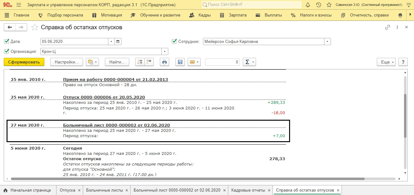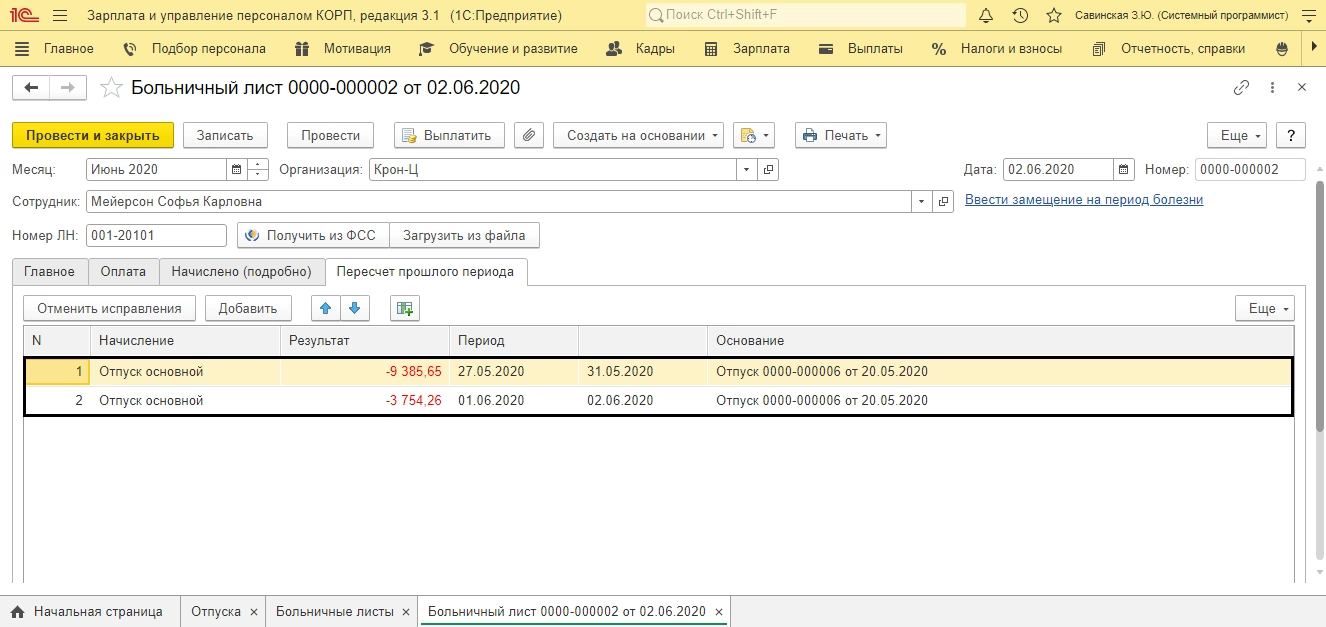 Эти дни вычитаются из отпуска и отпуск продляется: сотрудница Мейерсон Софья Карповна находилась в отпуске в период с 25.05.2020 по 11.06.2020 года. В период нахождения в отпуске она заболела и предоставила больничный лист на период с 27.05.2020 по 02.06.2020 года. Необходимо отразить больничный и продлить отпуск, на необходимое количество дней.