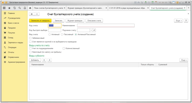 При нажатии кнопки «Создать» открывается окно, позволяющее ввести новый счет в уже имеющийся план счетов. Счет в 1С 8.3 можно также создать с копированием текущего счета.