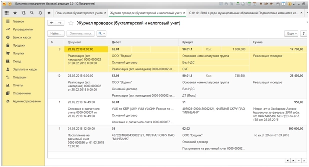 В данном окне предусмотрена функция поиска по дате, документу, счету, по количеству или субконто, а также возможность установления определенного периода.