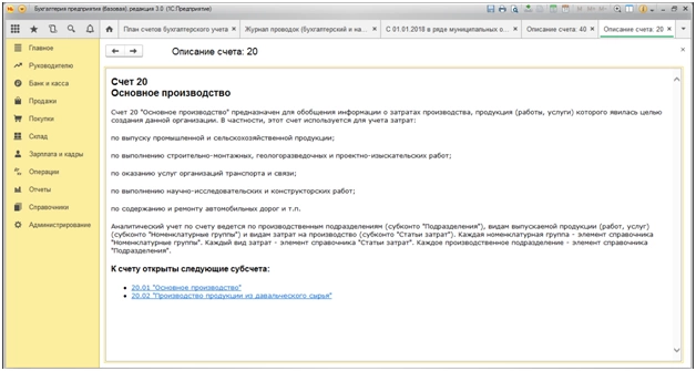 При наведении курсора на любую строку плана счетов и последующее нажатие кнопки «Описание счета» позволяет вывести на экран полное описание счета, открытые субсчета (при наличии) и привязанные субконто.