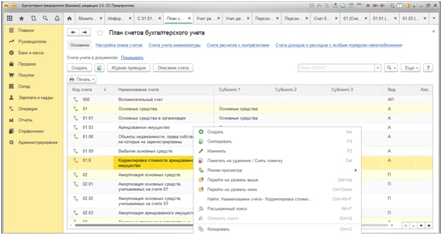 Добавить счет в план счетов также можно, наведя курсор на любое место в данном окне и кликнув правой кнопкой мыши. Откроется панель инструментов, среди которых есть возможность выбора кнопок «Создать», «Скопировать», «Изменить». Кроме того, аналогичные возможности открываются при нажатии «Еще» в правой стороне экрана.