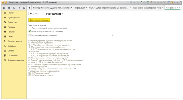 На нашем примере видно, что изначально системой установлено, что учет запасов ведется по номенклатуре. Наведя курсор на данную ячейку, попадаем в окно редактирования учета запасов, где мы выбираем также аналитический учет и по партиям (документам поступления). Нажимаем кнопку «Записать и закрыть». При желании также можно вести учет и по складам хранения.