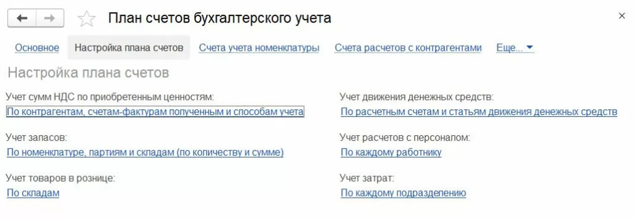 Этот процесс предусматривает изменения по следующим блокам: по учету запасов (в разрезе складов, номенклатуре или партиям товаров), учету товаров в рознице (в разрезе складов, номенклатуре, либо ставкам НДС), учет расчетов с сотрудниками (в разрезе каждого работника (рекомендуется для малых предприятий) и сводно – по всем работникам). Учет ДС по расчетным счетам можно дополнить опцией по учету по статьям ДДС, включающей в себя информацию в разрезе платежных карт, платежных требований, денежных документов и проч.