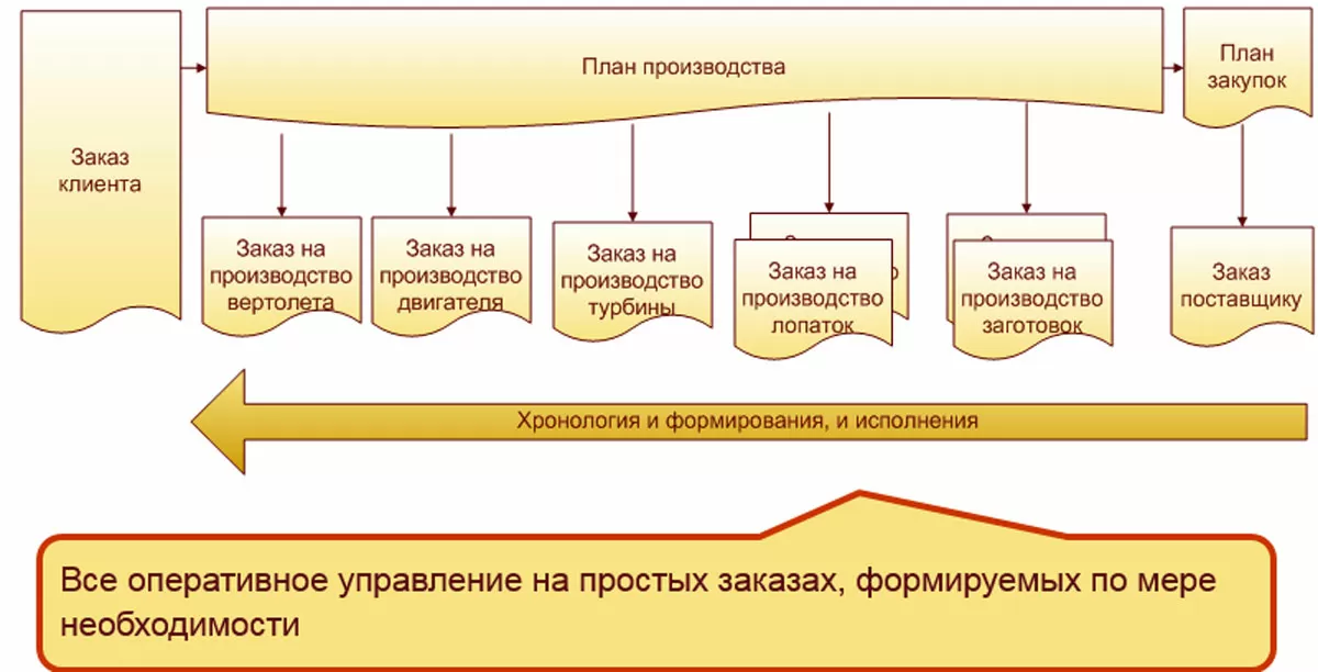 Все оперативное управление строится на простых заказах на производство, которые формируются по мере необходимости, причем источником данных о сроках планирования производства выступают планы производства, т.е. даже отсутствует необходимость использовать график производства.