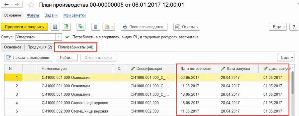 Суть доработки 1С заключается в следующем: система по спецификациям, указанным в плане производства, выявляет материалы, из которых состоит готовая продукция (по факту это производимые полуфабрикаты), и разузловывает такой полуфабрикат дальше по всему дереву, определяя исходные материалы, из которых состоят такие полуфабрикаты. При разузловании система рассчитывает сроки производства (исходя из данных ресурсных спецификаций), а полученный результат сохраняет в плане производства с учетом расчетной даты запуска в производство. При этом потребность в полуфабрикатах из разных периодов может консолидироваться в один выпуск.