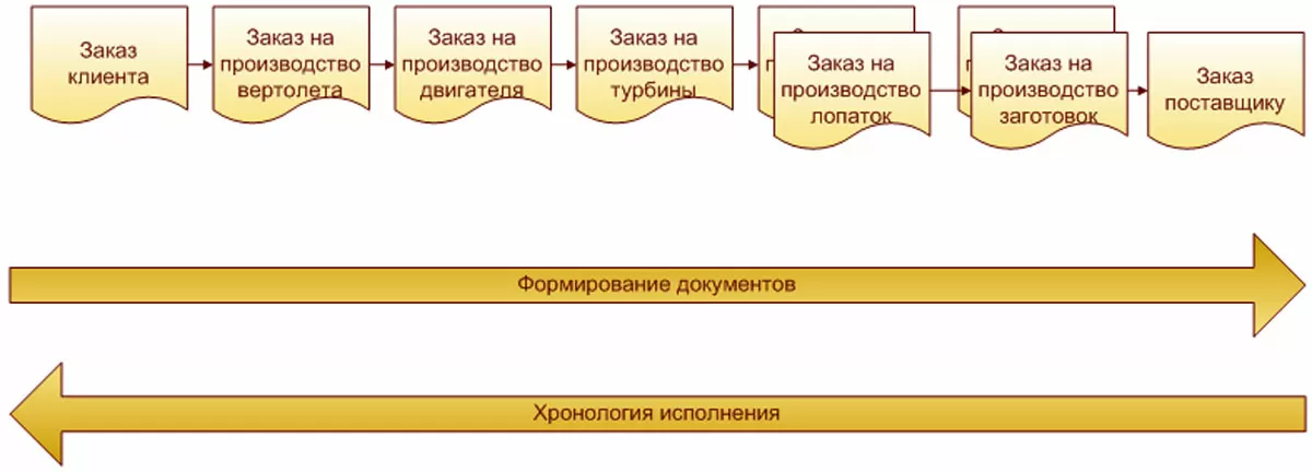 Чтобы получить потребность в материалах, нам придется сформировать все заказы на производство в той последовательности, в которой направлена стрелочка «Формирование документов». При этом хронологическое исполнение пойдет в обратном направлении: мы сперва будем исполнять заказ поставщику, затем делать мелкие детали и так далее до заказа клиента.