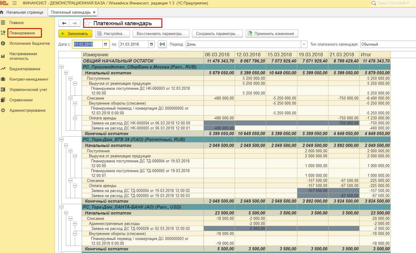Распределять суммы планируемых платежей в платежном календаре 1С можно, перейдя к первичному документу из формы отчета, или напрямую в отчете, перемещая суммы между датами в режиме «drag&drop» (в этом случае сумма заявки перемещается на другую дату оплаты). Перемещая строки с суммами по платежному календарю, пользователь получает в режиме оnline новое состояние платежного календаря с пересчитанными остатками и сразу видит необходимое количество денежных средств и возможные кассовые разрывы.