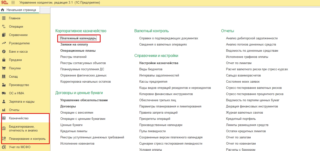 Платежный календарь в 1С:ERP Управление предприятием 2 Подробно о том, как работать с платежным календарем в 1С:ERP, можно также прочитать на нашем сайте.«1С:Управление холдингом» позволит автоматизировать бизнес-процессы бюджетирования, бизнес-анализа, консолидации различных отчетов в управляющих компаниях и в финансовых службах бизнес-единиц холдингов. Программа позволит наладить контроль и учет для эффективного управления работой холдинга, в том числе, и процесс управления денежными средствами с платежным календарем.