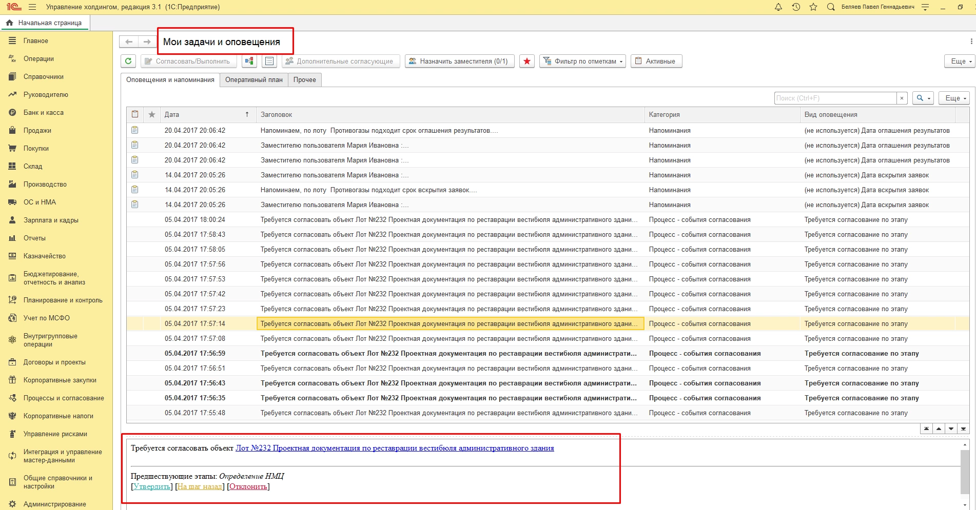 Перед этим инициатор, это может быть один исполнитель или группа исполнителей, заводит документ (бюджет, корректировка бюджета, заявка на расходование и другие документы) и отправляет по маршруту согласования. Ответственный сотрудник согласовывает (отклоняет, запрашивает дополнительную информацию, отправляет на доработку документ и т.д), используя удобные инструменты для согласования – «Мои задачи и оповещения», «Рабочий стол согласования», «Календарь событий» и т.д.