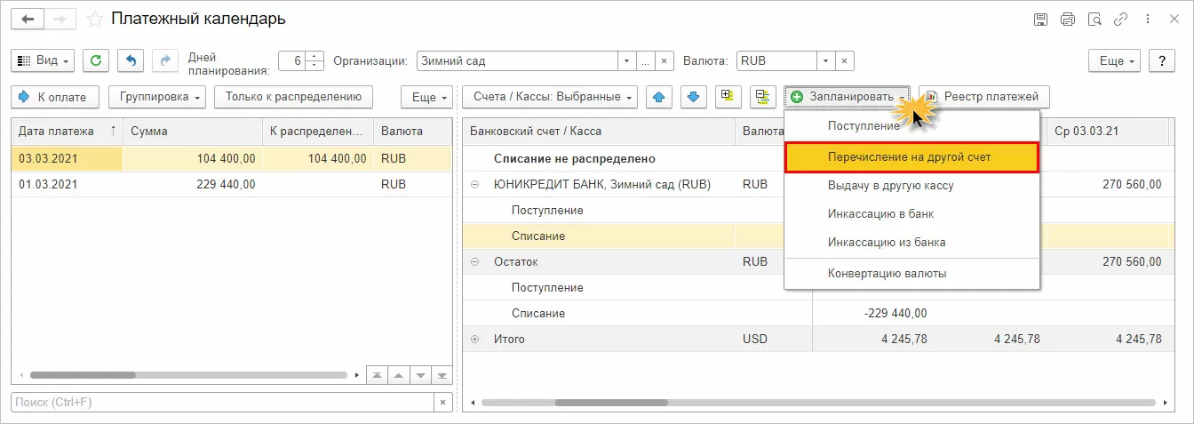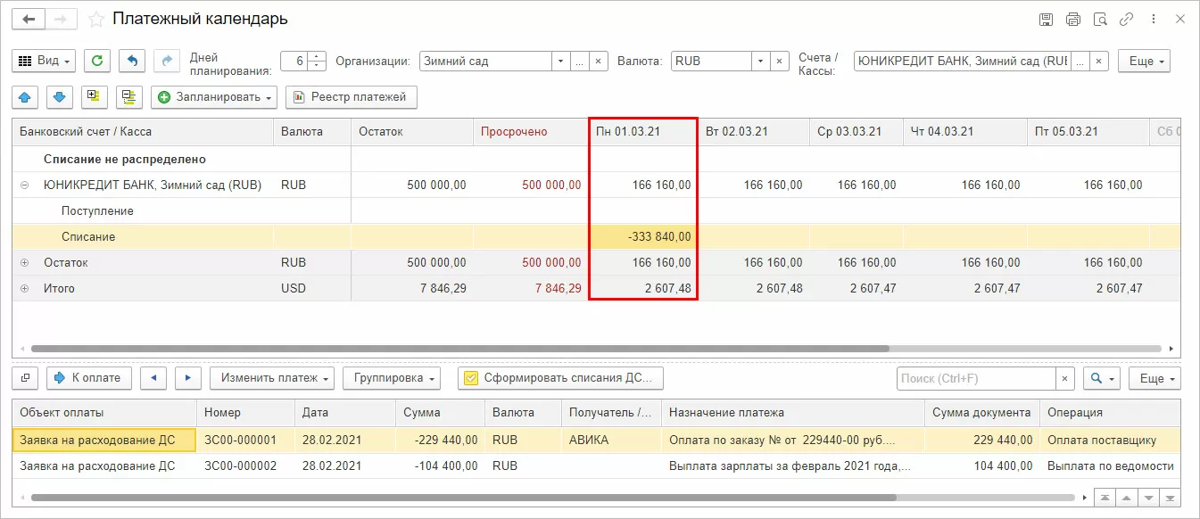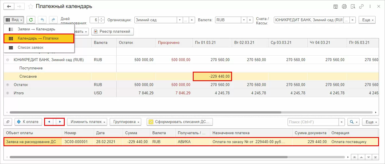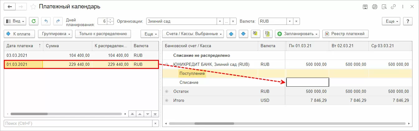 Когда сам казначей решает, откуда лучше произвести оплату, он может перенести заявку на нужную дату вручную. Для этого нужно взять мышкой за «Документ-разрешение» и перетащить в нужную дату ПК. ООО «Зимний сад» хочет произвести оплату 01.03.2021г. со счета «Юникредитбанка».