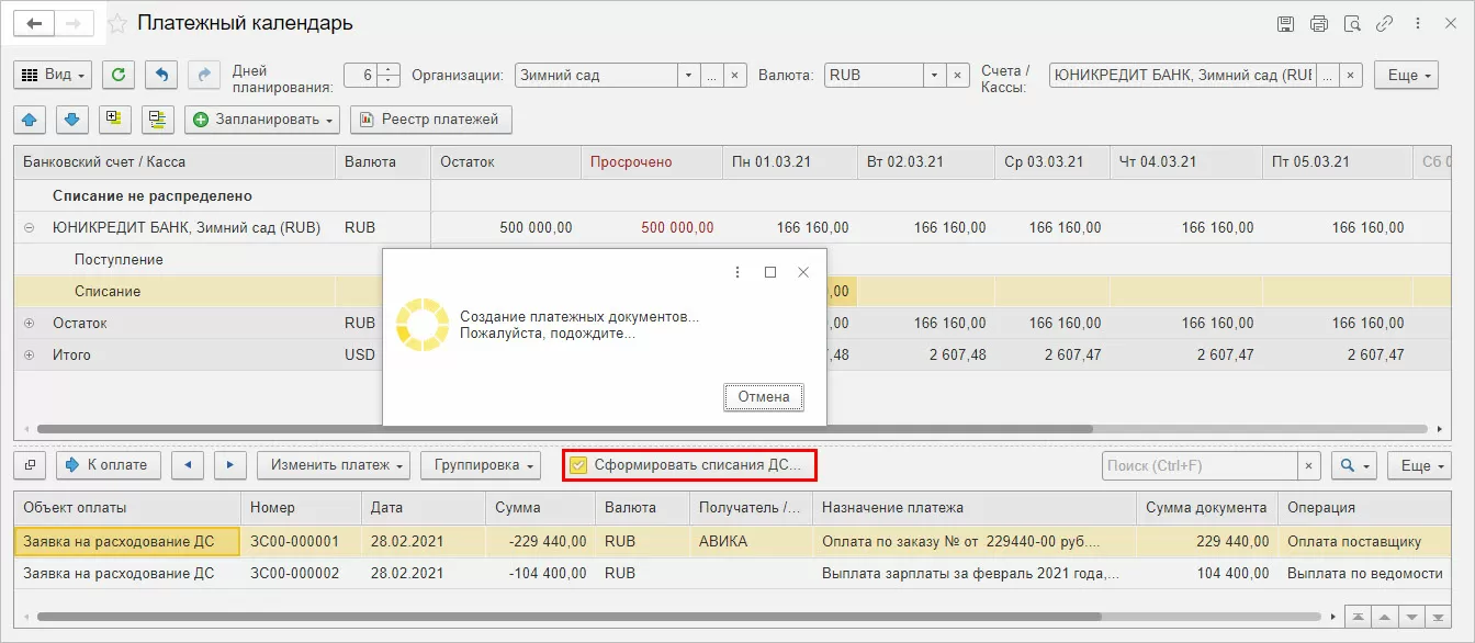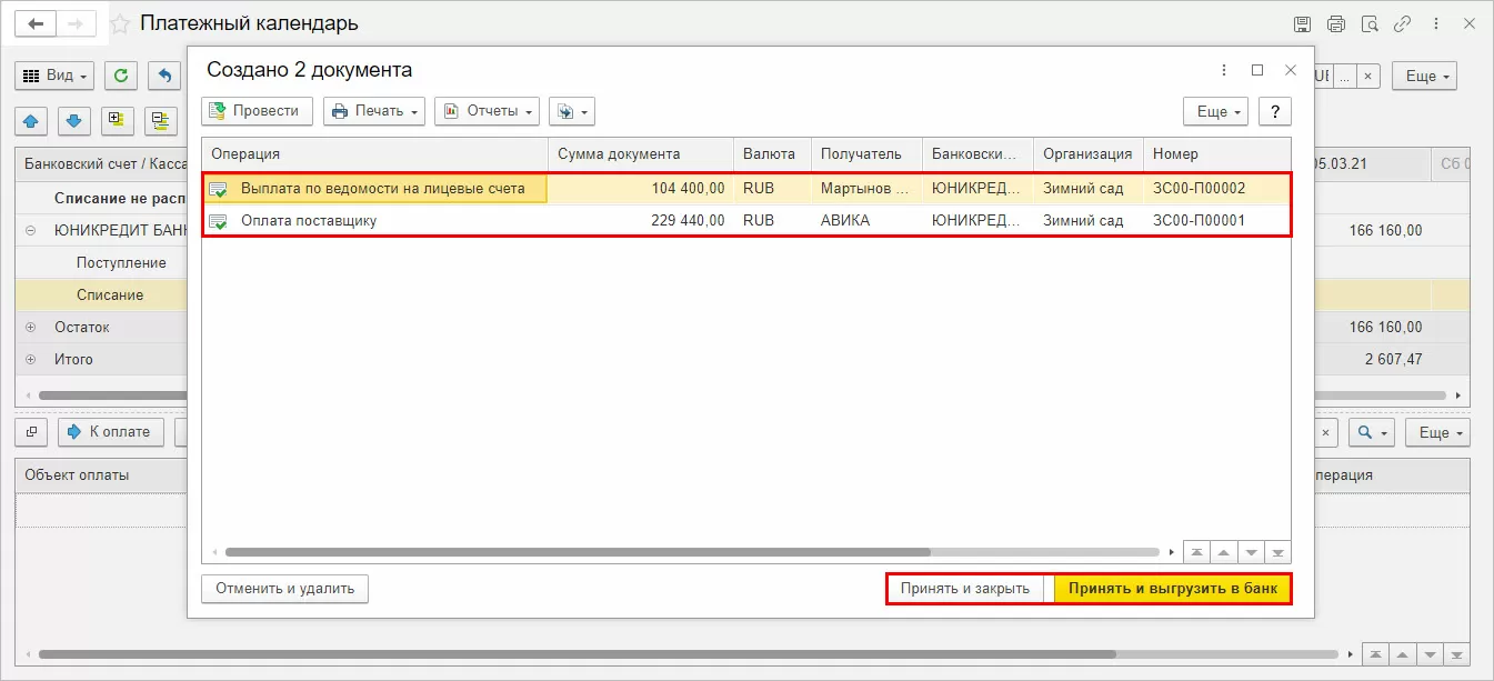 В результате формируются документы по всем запланированным в этот день оплатам. Для их отправки нажмите «Принять и выгрузить в банк» или просто – «Принять». Во втором случае документы будут сохранены.