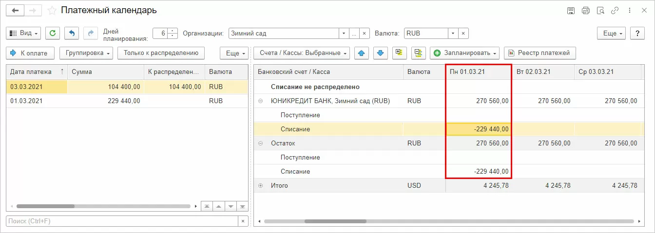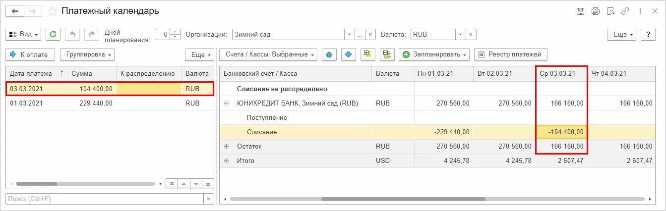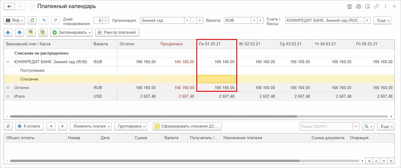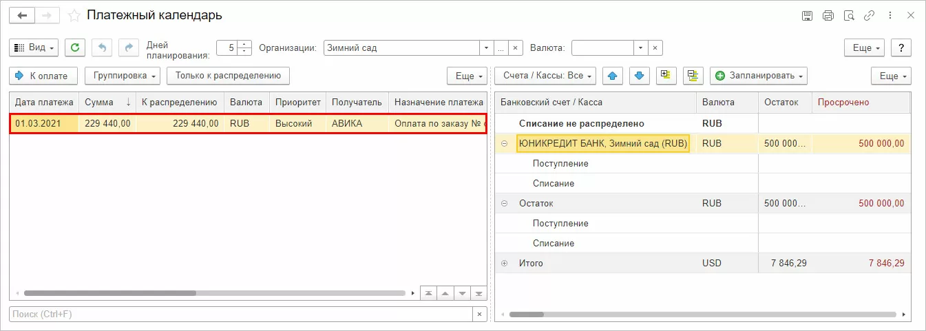 Второй вариант работы с календарем – автоматическое «разнесение» платежей по дням. Чтобы его активировать, воспользуемся командой «К оплате». Альтернатива – комбинация клавиш «CTRL+P».