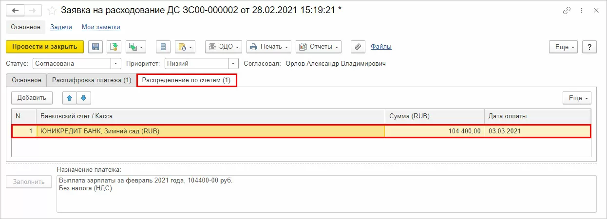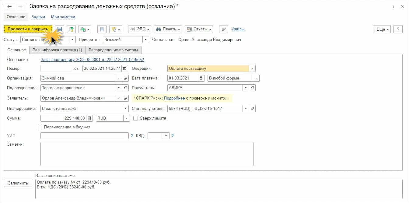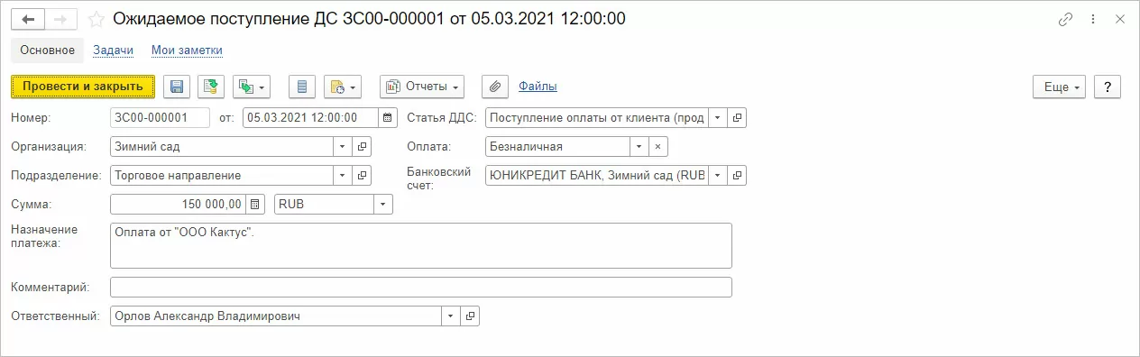 Заполните документ, указав статью ДДС, подразделение, сумму и другие требуемые поля. Проведите и закройте его.