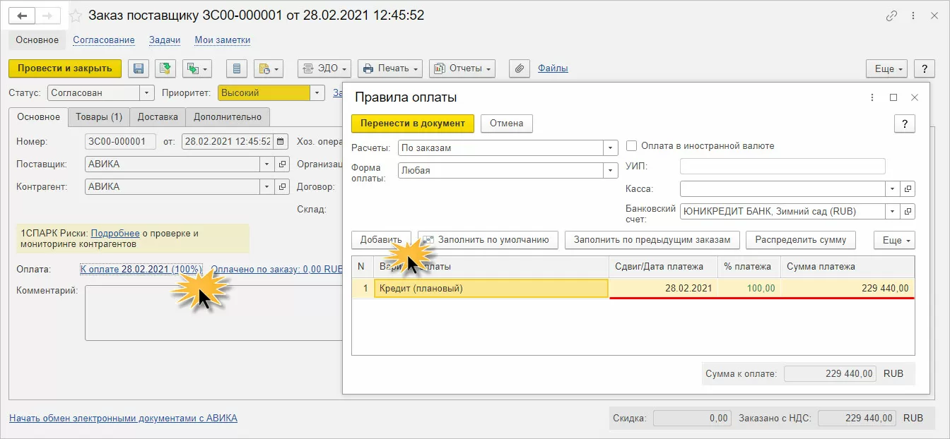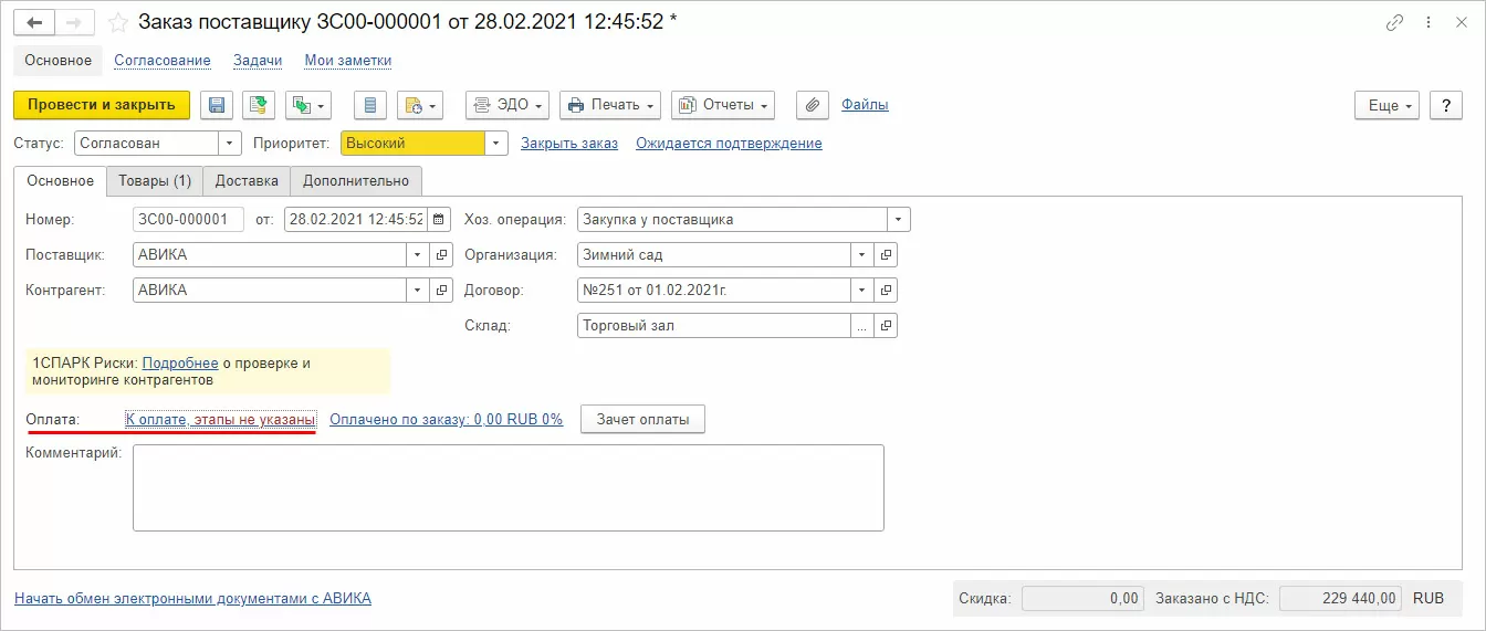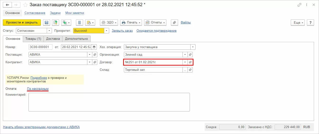 Чтобы понять суть проблемы, обратите внимание на раздел «Оплата». В примере договора ООО «Авика» установлена оплата по «Накладным», а не по «Заказу поставщику».