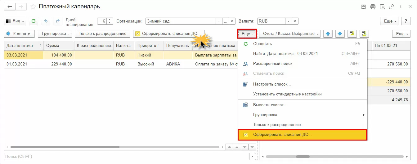 Для автоматического генерирования платежного поручения в банк предназначена кнопка «Сформировать списание ДС». Если кнопка на панели не видна – увеличьте левую область окна, и кнопка появится. Эта же команда находится в кнопке-меню «Еще».