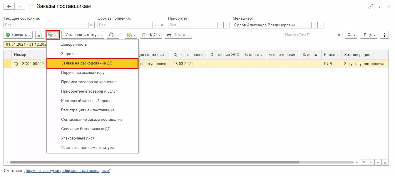 После этих изменений, в разделе оплата «Заказа поставщику» изменится отметка, и пользователь без проблем сформирует «Заявку на расходование ДС» прямо из этого документа.