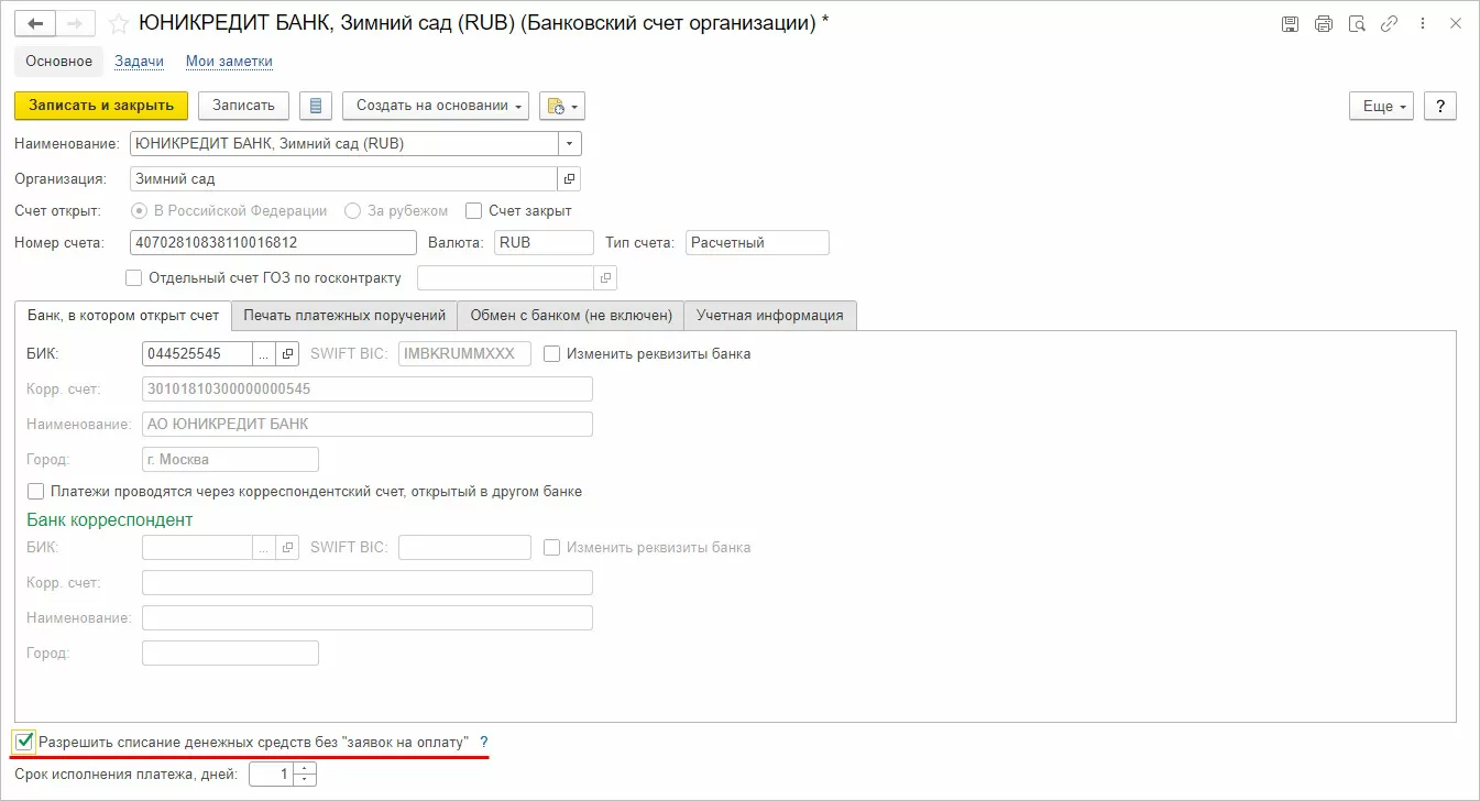 При загрузке документов из других программ, они будут проводиться только при установленной галочке «Разрешить списание денежных средств без «Заявок на оплату». Когда заявка формируется по данным другого документа, все в ней заполнятся автоматом.