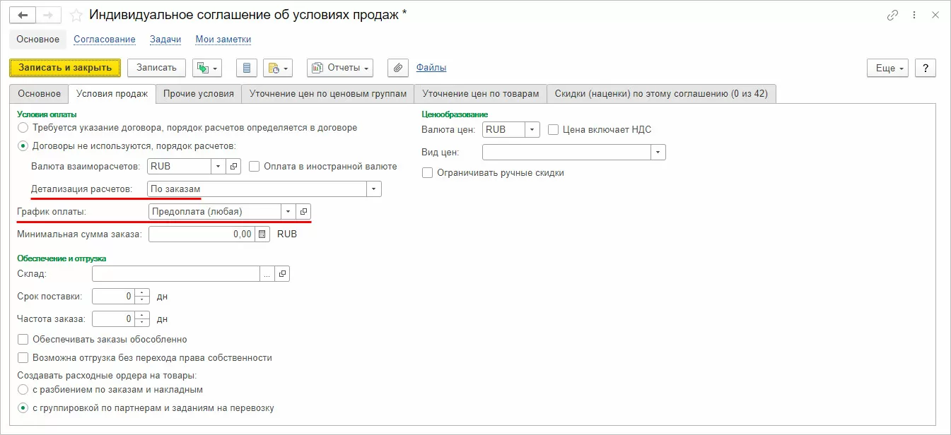 При оформлении соглашения об условиях продаж с клиентом обратите внимание на поля «Детализация расчетов» и «График оплаты». Расчеты могут быть на основе: