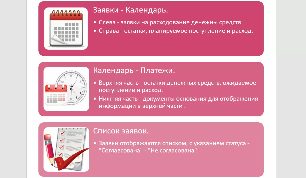 - «Заявки – календарь». В одной стороне окна пользователь увидит созданные заявки на оплаты, в противоположной – сведения о наличии денег, планируемые суммы их притока и оттока.