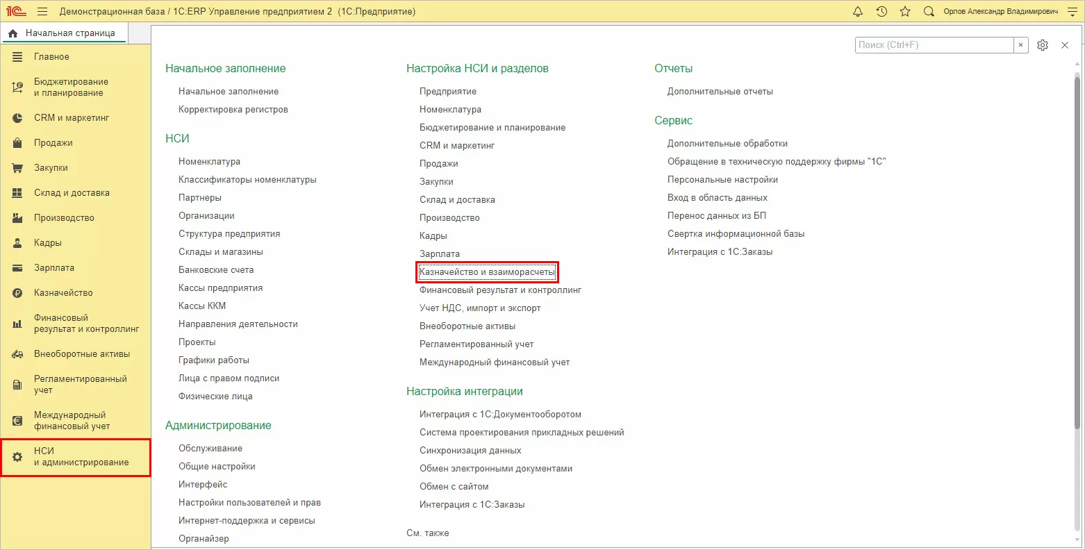 Настройки применения платежного календаря в 1С:ERP заданы по умолчанию. Чтобы их проверить, перейдите в пункт «НСИ и администрирование- Настройка НСИ и разделов-Казначейство и взаиморасчеты».