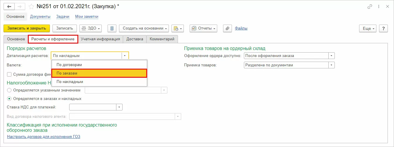 Перейдем к вкладке «Расчеты и оформление». Изменим детализацию в разделе «Порядок расчетов», задав значение – «По заказам».