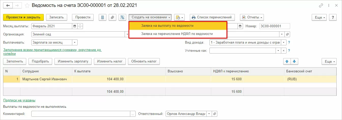 Сформировать заявки можно из любого документа выплаты зарплаты – «Ведомость на счета», «Ведомость в кассу» и т.п. Для примера сформируем «заявку-одобрение» на перечисление сотруднику ООО «Зимний сад», Мартынов С.И. на карту, взяв за основание «Ведомость на счета».